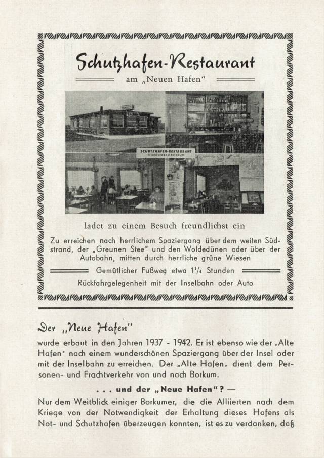 .....wurde erbaut in den Jahren 1937 - 1942. Er ist ebenso wie der "Alte Hafen" noch einem wunderschönen Spaziergang über der Insel oder mit der Inselbahn zu erreichen, Der „Alte Hafen" dient dem Personen- und Frachtverkehr von und noch Borkum, und der „ Neue Hafen" ? - Nur dem Weitblick einiger Borkumer, die die Alliierten noch dem Kriege von der Notwendigkeit der Erhaltung dieses Hafens als Not- und Schutzhefen überzeugen konnten, ist es zu verdanken, daß er nicht zerstört wurde, sondern im Gegenteil heute noch weiter ausgebaut und in Zukunft euch der Bundesmorine dienen wird. Er bot im vergangenen Jahrzehnt vieln ausländischen und deutschen Küstenfahrzeugen und auch Dampfern sicheren Unterschlupf vor schwersten Stürmen. An seinen Pontons liegt ein Hochseebergungsschlepper ständig bereit für in Seenot befindliche Dampfer und Seefahrzeuge. Seenotkreuzer „Theodor Heuß" liegt immer auf Wacht im Hafen, um im schnellsten Einsatz in Lebensgefahr befindliche Menschen zu retten. Unsere große Fischereiflotte gibt dem Hafen ein lebendiges Bild. Man sollte sich daher einen Besuch nicht entgehen lassen.