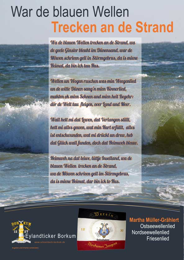 Heimweh na dat leiwe, lüttje Inselland, wa de blauen Wellen trecken an de Strand, wa de Möwen schrieen gell im Störmgebrus, da is miene Heimat, dar bin ick to Hus.
