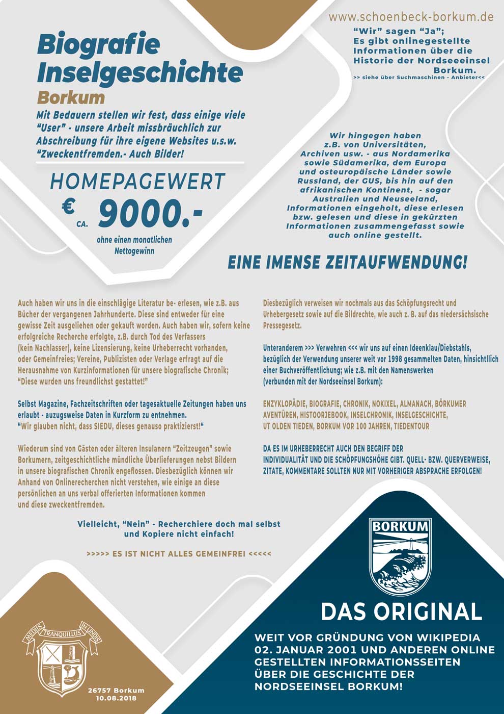 Zeitreise in die "Historische Insulare Borkumer Vergangenheit".....und der Gegenwart bis "Heute"; Das Original - Weit vor Gründung von Wikipedia 2. Januar 2001 und allen anderen online gestellten Informationsseiten über die Geschichte der Insel! Mit hartlek Gröten www.schoenbeck-borkum.de; Borkum, den 10.08.2018 PDF